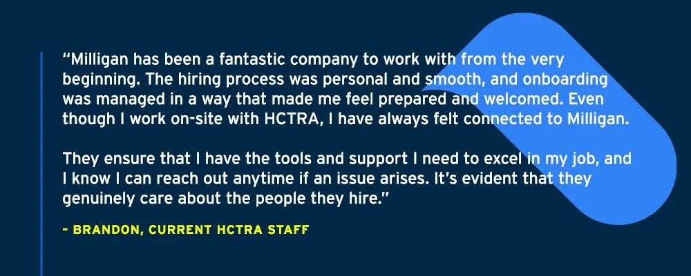 Our investment pays off: in 2024 alone, 15 employees transitioned from Milligan contractors to full-time employees at their client agency. On average, our staff spend about two years with Milligan before making that seamless transition—a process we intentionally support from the start. As one employee shared: